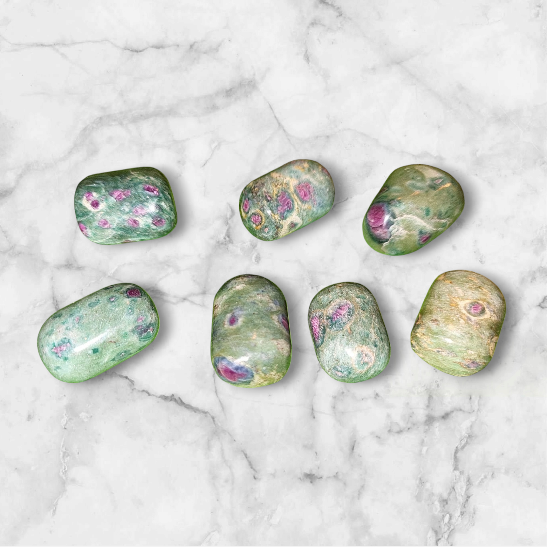 Diese Trommelsteine sind von sehr guter Qualität und wurden sorgfältig poliert, um die farblichen Nuancen und das Zusammenspiel von Rubin und Fuchsit optimal zur Geltung zu bringen. Die kräftigen Farben des Rubins und das beruhigende Grün des Fuchsits machen jeden Stein zu einem kleinen Kunstwerk der Natur.